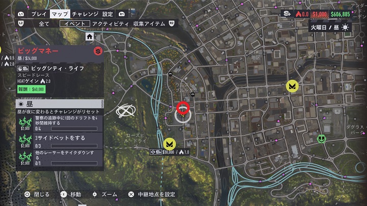 赤い丸のところにジャンプ台がある。他の場所から上ると、警察が追いかけてくるかも。